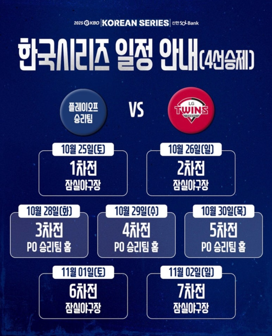 그리고 대망의 한국시리즈! 올해는 정규시즌 1위이자 디펜딩 챔피언인 LG 트윈스가 직행했습니다. 10월 25일부터 4선승제로 열리는 한국시리즈에서는 “LG가 2연패를 달성할 수 있을까?”라는 관심이 집중되고 있습니다. LG는 정규시즌 내내 탄탄한 마운드와 집중력으로 우승을 거머쥐었고, 충분한 휴식까지 확보했죠. 과연 도전자의 반란이 있을지, 왕좌의 수성이 이뤄질지… 야구팬이라면 절대 놓칠 수 없는 순간입니다!