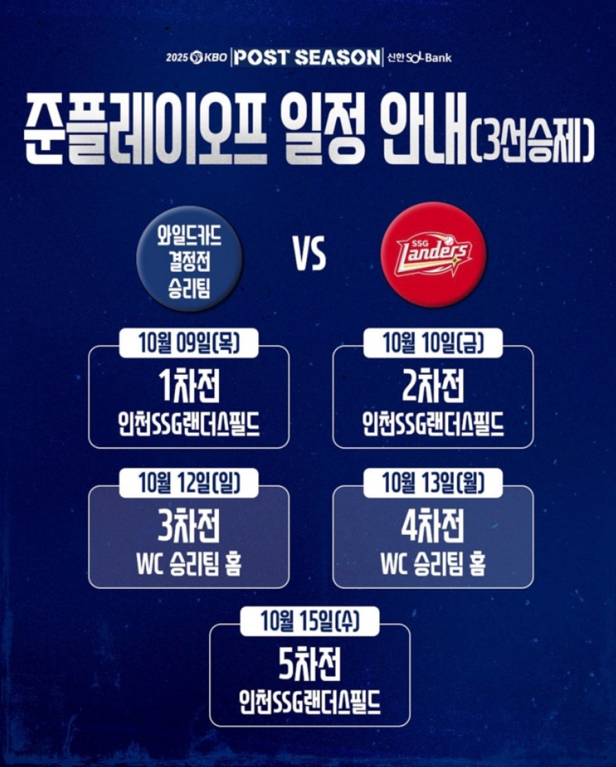 와일드카드 승리팀은 곧바로 3위 SSG 랜더스와 맞붙게 됩니다. 10월 9일부터 시작되는 준플레이오프는 3선승제로 진행되며, 체력과 집중력이 중요한 승부 포인트로 꼽히고 있습니다. 와일드카드 혈투로 올라온 팀이 기세를 이어갈지, 아니면 SSG가 여유로운 준비로 압도할지, 정말 예측하기 어려운 대진이에요.