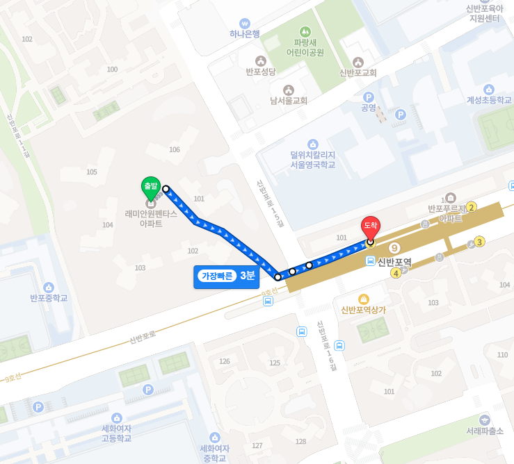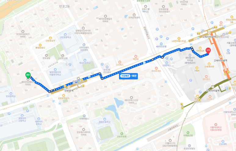 조금만 걸으면 3호선·7호선·9호선이 교차하는 고속터미널역도 이용 가능해요.