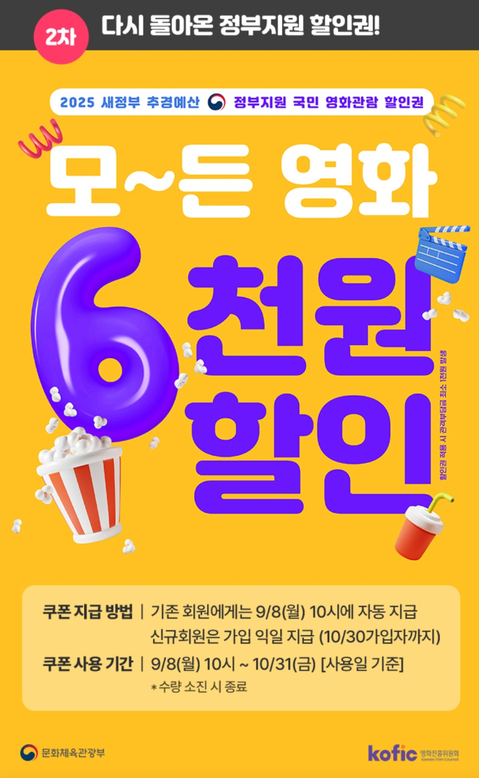 이번 2025 영화 6000원 할인권은 단순한 이벤트가 아니라, 정부가 국민들의 문화생활을 지원하고 영화 산업을 되살리기 위해 마련한 대규모 정책이에요. 평소 관람료 부담 때문에 망설였던 분들이라면 이번 기회에 꼭 챙기셔서 저렴하게 극장에서 영화 한 편 즐기시길 바랍니다.