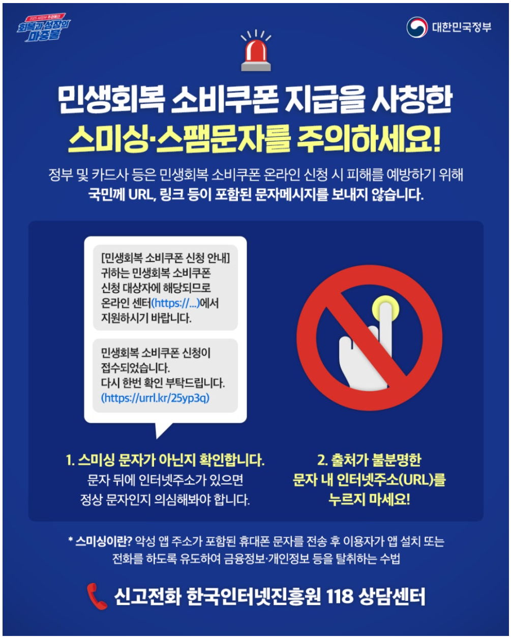 정부는 예방을 위해 통신사 명의의 ‘스미싱 피해 예방 문자’를 순차적으로 발송할 예정이며, 신청 페이지와 주민센터 현장 접수 시에도 주의 안내를 병행한다고 합니다.