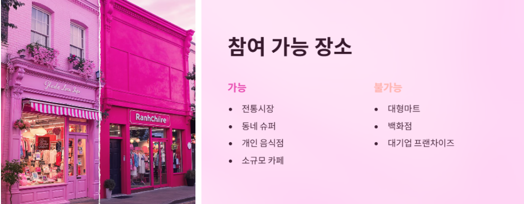 | 참여 장소 | 전통시장, 동네 슈퍼, 개인 음식점, 소규모 카페 | 대형마트, 백화점, 프랜차이즈 |
