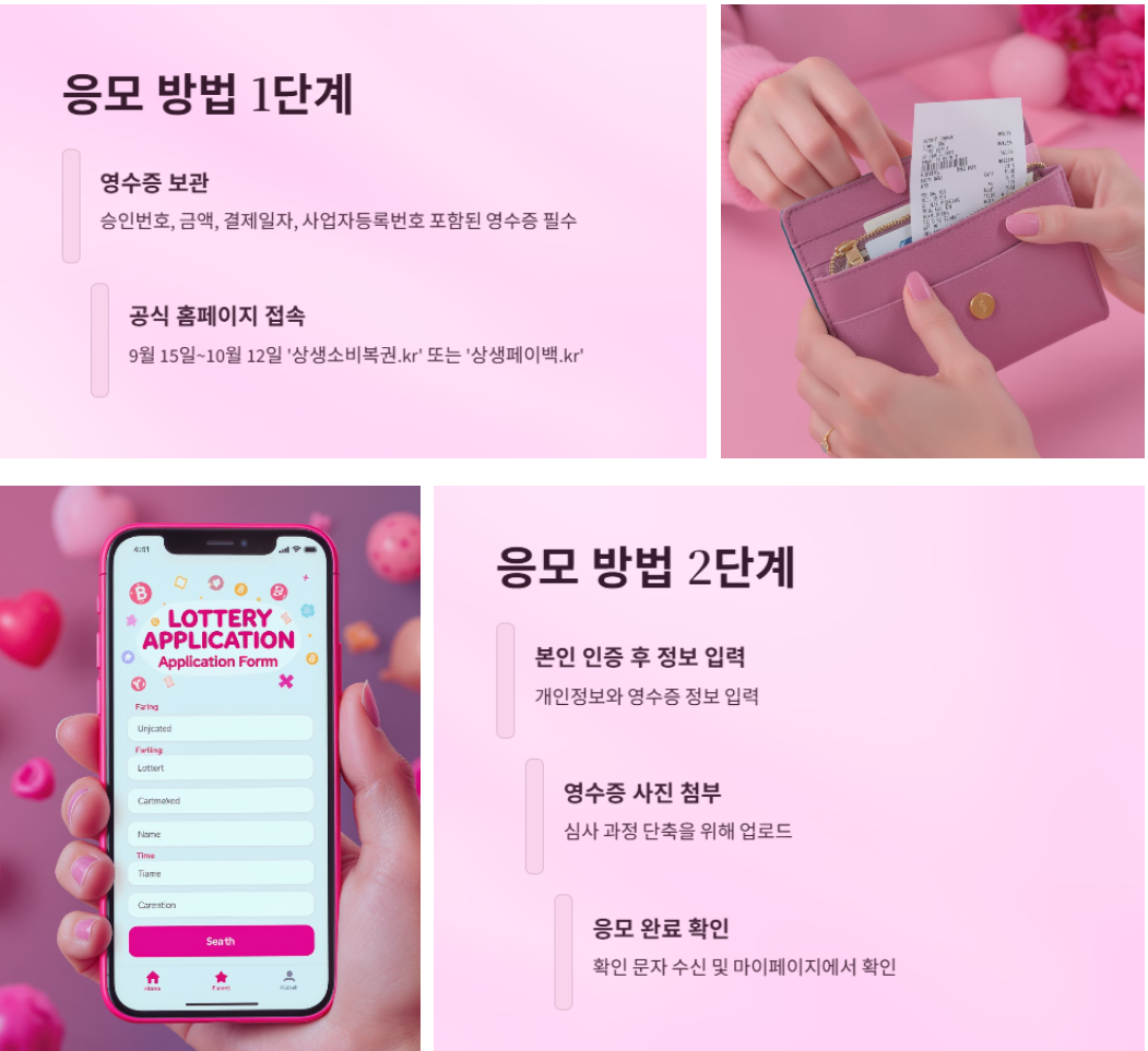 응모 절차는 간단합니다. 우선 행사 기간에 결제한 영수증을 보관해야 하며, 이후 9월15일부터 오픈하는 상생페이백 누리집 홈페이지에 접속하여 본인 인증을 진행하고 결제 내역을 입력합니다. 영수증 사진을 첨부하면 심사 과정이 더 빨라집니다. 응모가 완료되면 휴대폰으로 확인 문자가 발송됩니다.