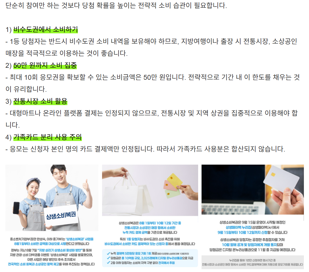 당첨 확률을 높이기 위해서는 결제를 쪼개서 진행하거나, 비수도권 매장에서 결제하는 것이 유리합니다. 또한 가족이나 지인과 함께 참여하면 응모권 수를 극대화할 수 있으며, 영수증을 체계적으로 정리해 두는 것도 신청 과정에서 큰 도움이 됩니다.