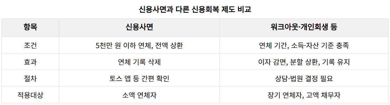 이렇게 비교해 보면, 신용사면은 소액 연체자에게 최적화된 제도임을 알 수 있습니다.