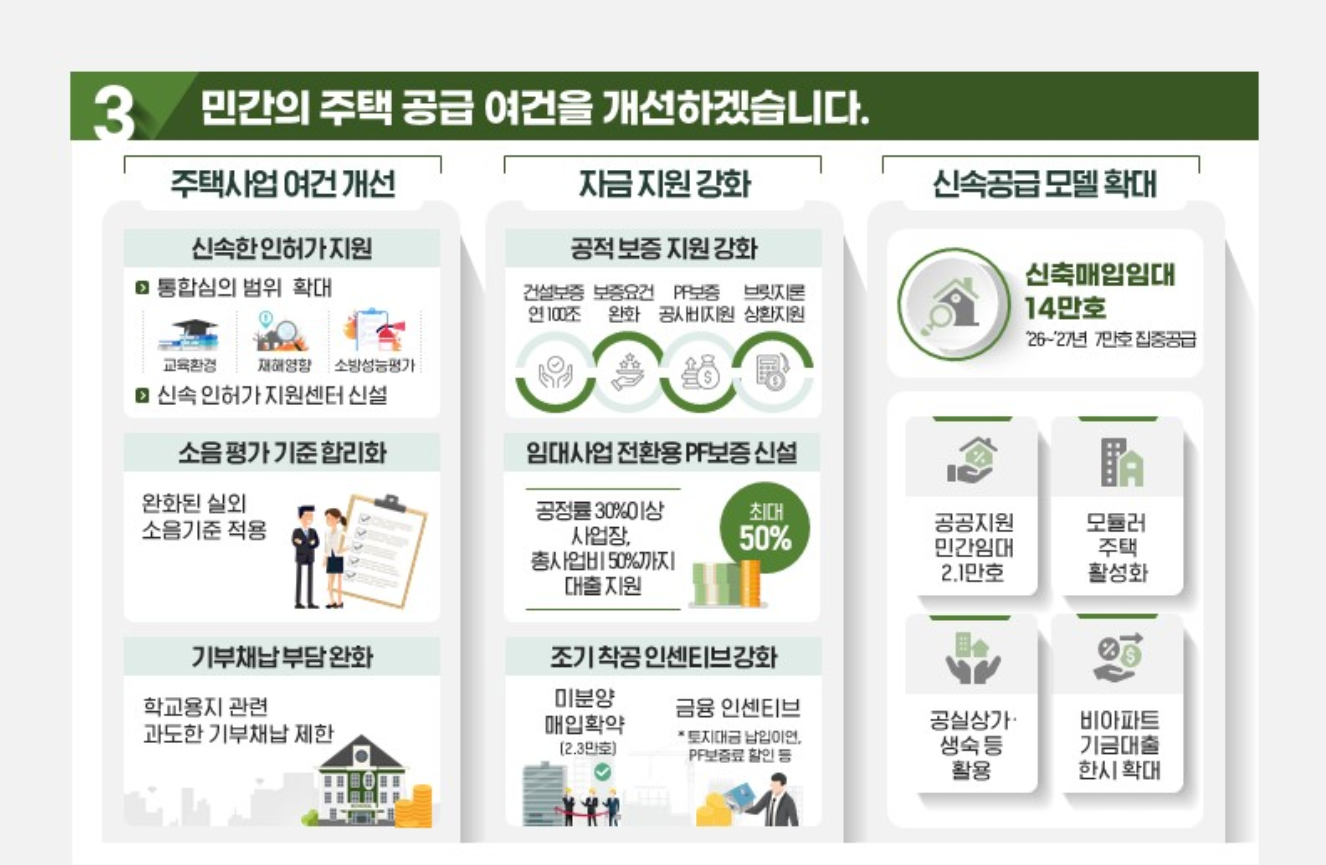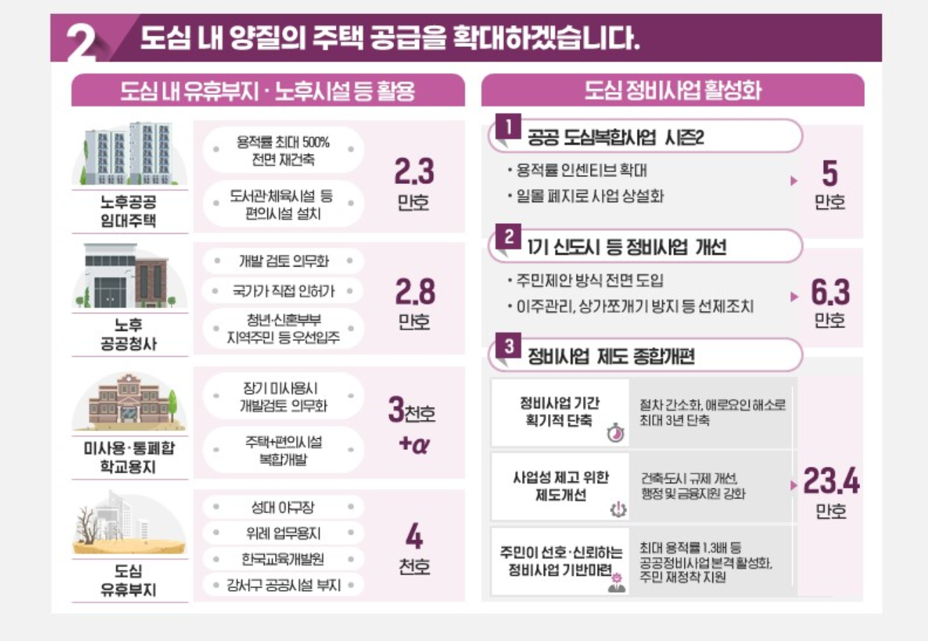 - 정비사업 활성화: 재개발·재건축 규제 완화로 도심 내 주택 공급 확대