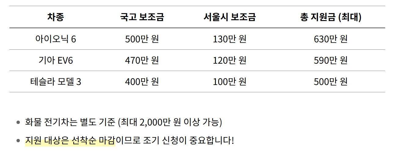 2025년 하반기 기준 정부와 지자체의 보조금을 합산하면 승용차 기준 최대 1,000만 원 이상 지원됩니다. 차종, 배터리 용량, 구매 지역에 따라 금액이 달라지며, 예를 들어 서울시에서는 아이오닉6가 최대 630만 원, 기아 EV6는 590만 원, 테슬라 모델3는 500만 원 지원을 받을 수 있습니다.