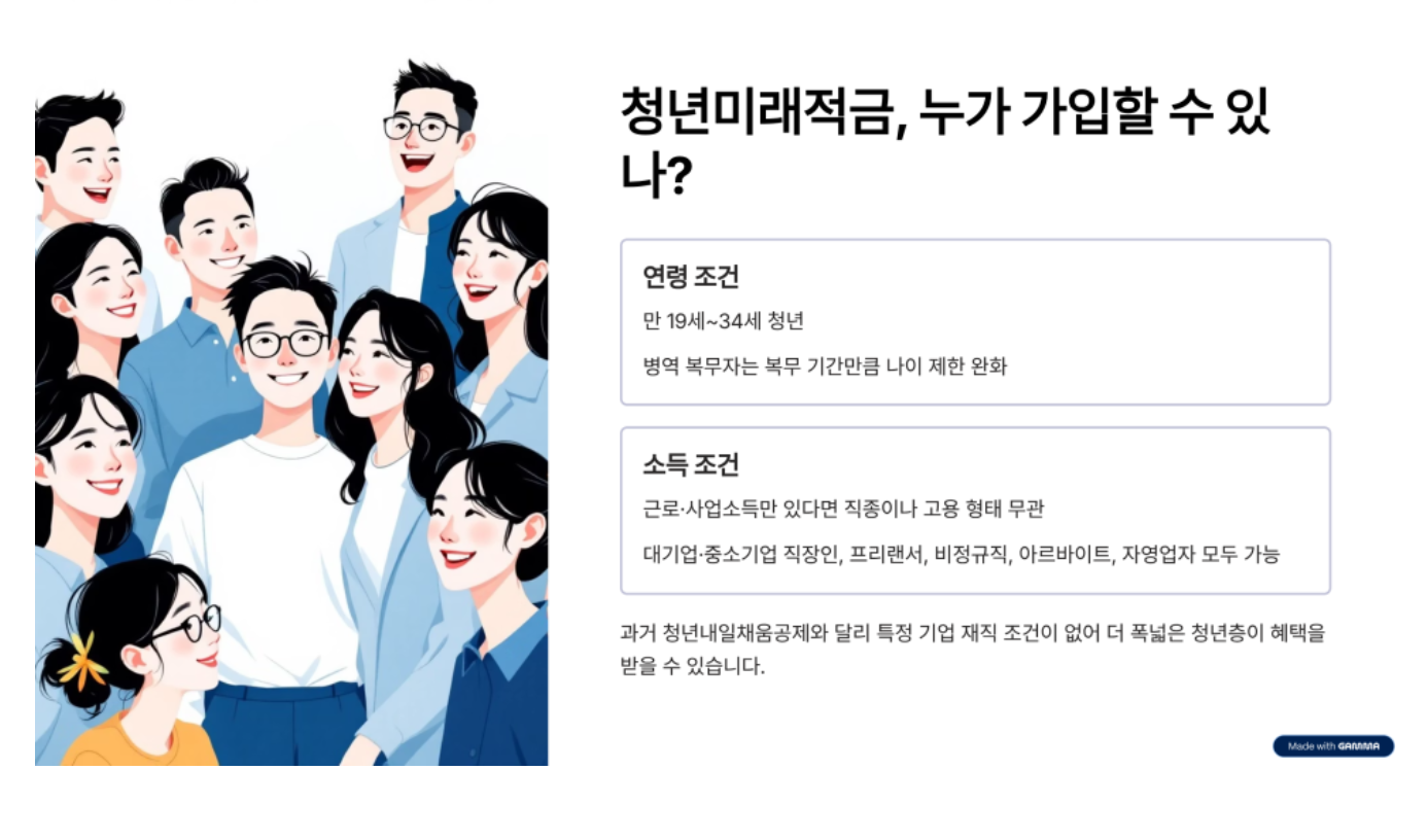 청년미래적금은 만 19~34세 청년 가운데 연소득 6,000만원 이하, 그리고 중위소득 200% 이하인 경우 가입이 가능합니다. 직업적으로는 특히 소상공인 종사자와 중소기업 재직자에게 혜택이 집중되어 있어요. 그동안 안정적인 금융 혜택에서 소외되었던 계층에게 새로운 기회가 열리는 셈이죠.