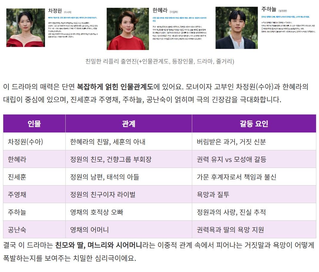 드라마는 어린 시절 버려진 딸과 어머니가 25년 만에 시어머니와 며느리라는 기묘한 관계로 다시 만나는 것에서 출발합니다. 극적인 재회 장면부터 긴장감을 자아내며, 단순한 선과 악의 대립을 넘어 각 인물들의 아픔과 사연이 복합적으로 얽혀 있죠. “왜 나만 좋은 사람이어야 하냐”는 차정원의 대사처럼, 이 작품은 현실적인 감정의 소용돌이를 진솔하게 담아내고 있어요.