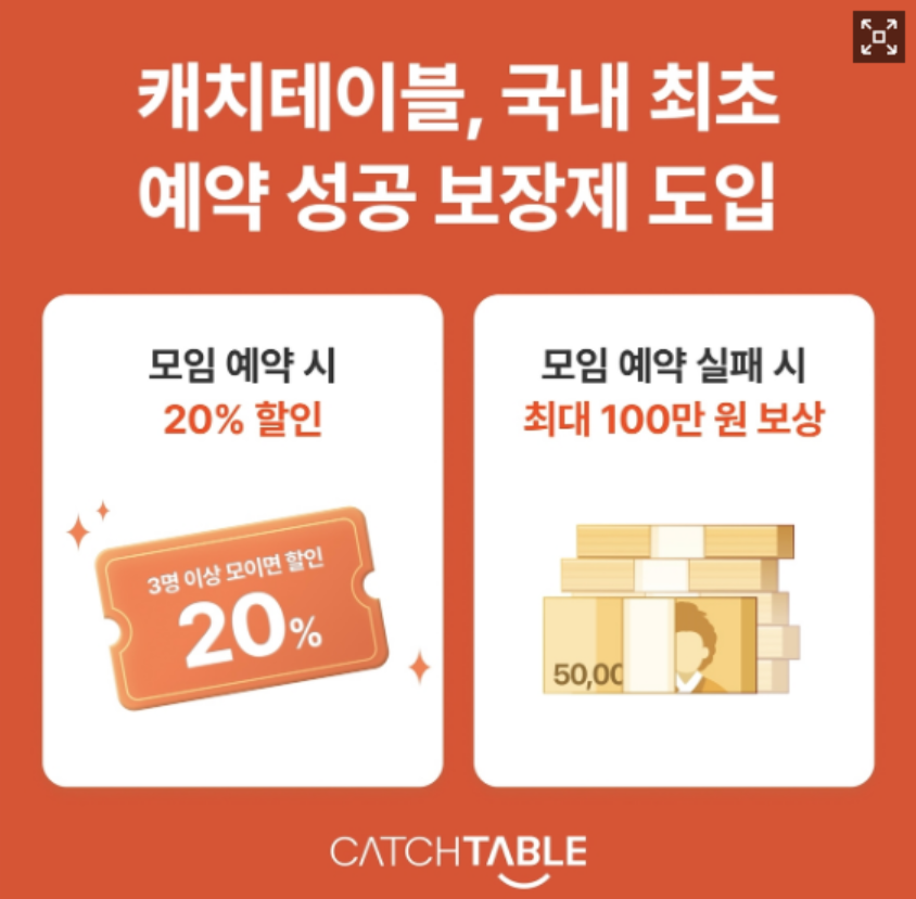 사랑하는 연인과의 기념일, 오래 준비한 비즈니스 미팅, 혹은 오랜만의 가족 모임. 이런 순간에 좌석 하나가 분위기를 완전히 바꿀 수 있습니다. 캐치테이블은 고객이 원하는 자리에서 최고의 순간을 보장하기 위해 ‘예약 성공 보장제’를 도입했어요. 모임 예약시 3인이상일 경우 20% 할인과 만약 예약한 좌석이 달라진다면, 최대 100만원까지 보상! 그만큼 자신 있다는 뜻이죠. 💡
