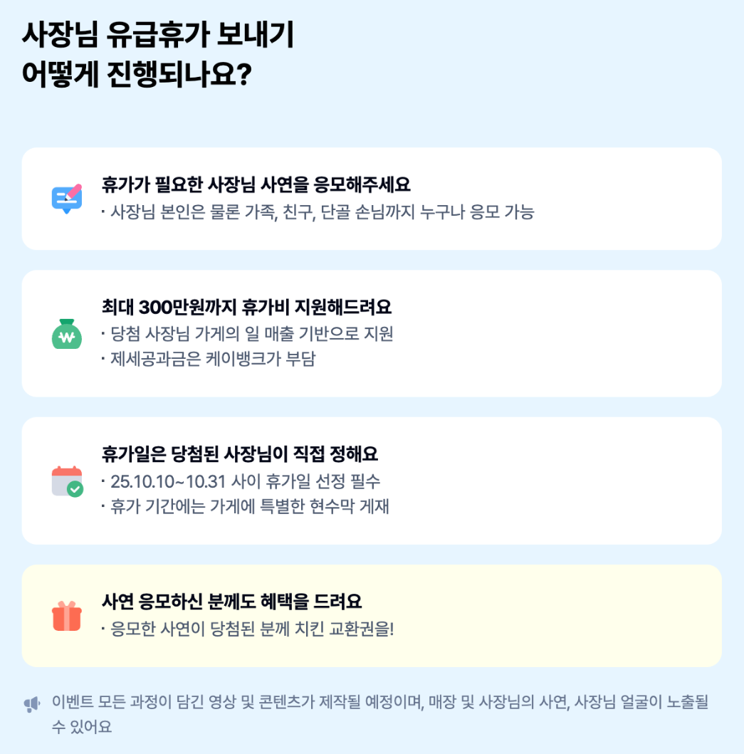 - 선정 후 지원 : 사연이 당첨되면 가게의 하루 평균 매출 기준으로 휴가비가 지급됩니다.
