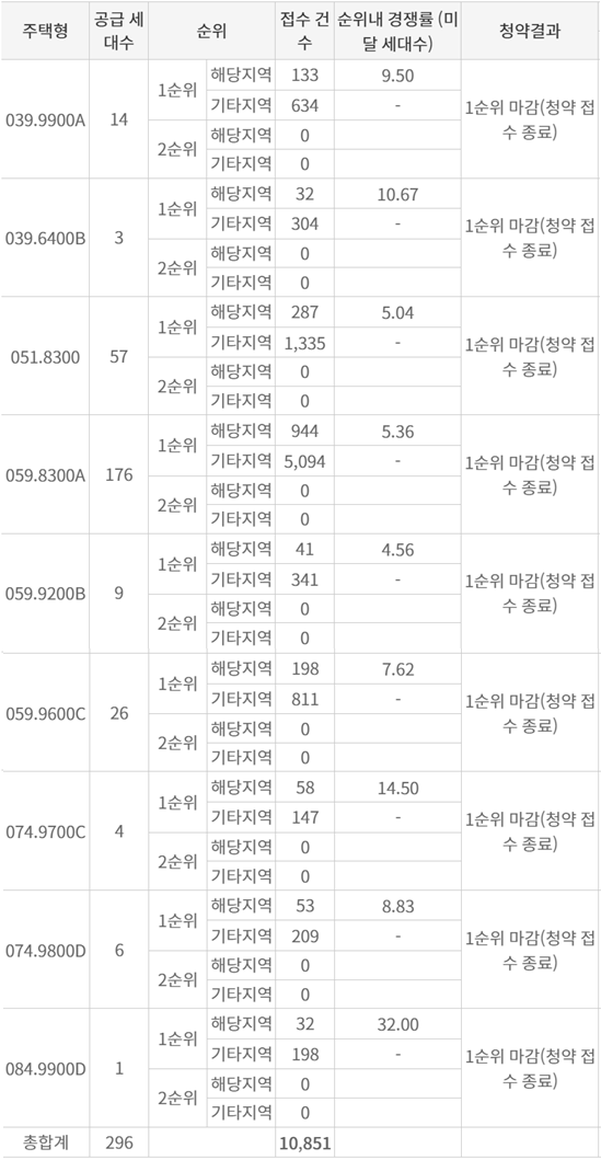 총 296세대 모집에 무려 1만851건의 청약서가 접수되며 평균 경쟁률 36.7:1, 최고 경쟁률은 84D타입의 230:1을 기록했습니다.