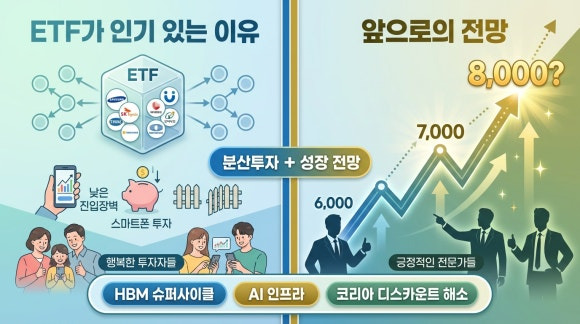 오늘은 코스피 6000 돌파의 배경부터, 지금 시점에서 ETF 투자가 괜찮은 선택인지, 그리고 반도체 ETF 전략은 어떻게 접근해야 할지 차분하게 정리해 보겠습니다 📊