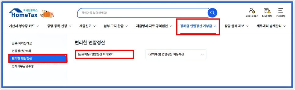 👉 [장려금/연말정산/기부금] → [편리한 연말정산] → [(근로자용) 연말정산 미리보기]