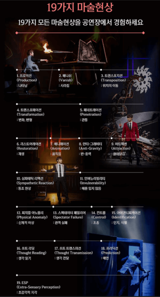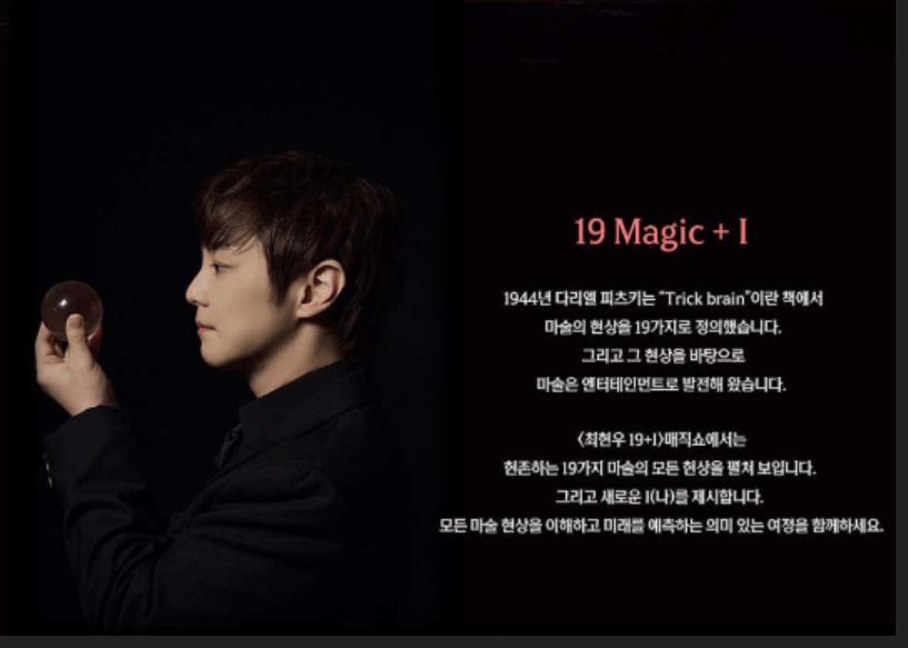 - 19+I는 ‘나타남, 사라짐, 변형, 예언’ 등 마술의 핵심 원리를 모두 보여주며, 마지막은 관객과 함께 완성하는 특별한 결말을 준비하고 있습니다.