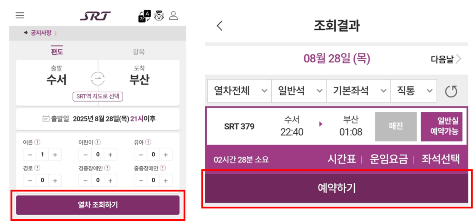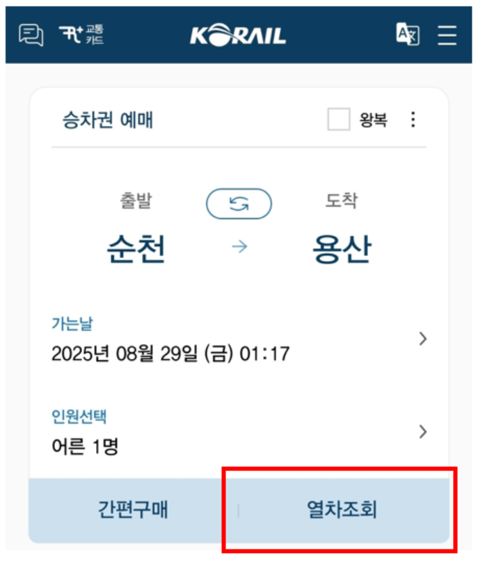 - 출발역, 도착역, 날짜, 인원 입력 후 열차 조회