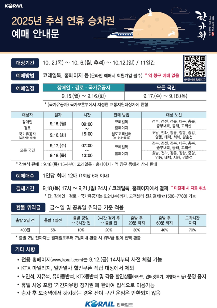 먼저 65세 이상 어르신, 등록 장애인, 국가유공자 등 교통약자를 위한 사전 예매가 9월 15일~16일 양일간 진행되며, 일반 국민을 위한 예매는 9월 17일~18일 이틀 동안 진행됩니다. 예매 시간대도 노선별로 나누어져 있으니 꼭 확인하셔야 해요.