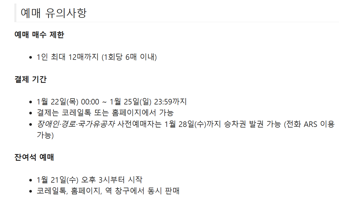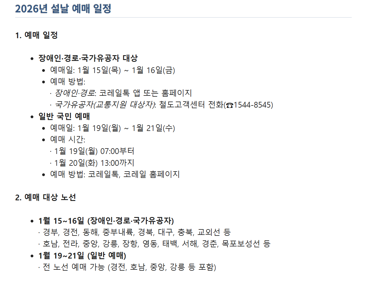 - SRT: 1월 15일 전후 예상 (경부·호남선 구분, 우선 예약자 1일 전 사전 예매)