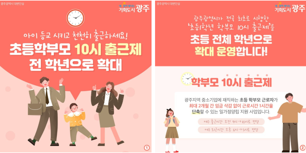 육아기 10시 출근제는 2022년 광주광역시에서 시범 운영을 시작했고, 높은 만족도와 긍정적인 성과를 바탕으로 2026년부터 전국적으로 확대 시행이 결정되었습니다. 배경에는 저출산 문제, 맞벌이 가정 증가, 경력 단절 여성 문제 등 사회적 과제가 자리 잡고 있습니다. 즉, 부모가 아침 시간에 아이를 직접 돌볼 수 있도록 보장함으로써 육아 부담을 줄이고 노동 시장의 안정성을 높이는 것이 목표라고 할 수 있습니다.