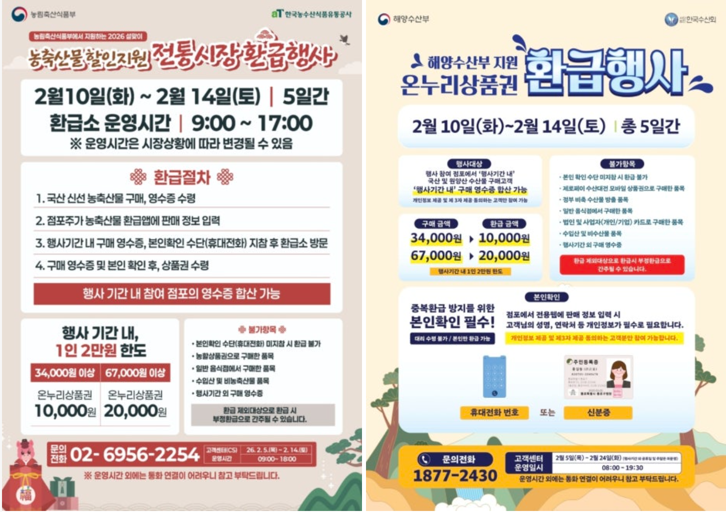 2026년 설 연휴를 앞두고 진행되는 전통시장 환급 행사도 눈여겨볼 부분입니다. 2월 10일부터 2월 14일까지 진행되며, 국산 농·축·수산물을 구매하면 금액 구간에 따라 온누리상품권으로 환급받을 수 있습니다.
