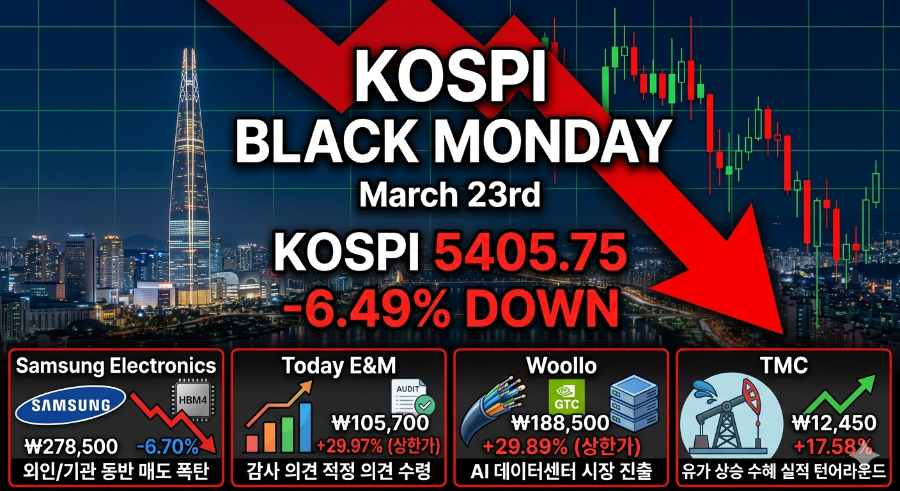 안녕하세요 😊 오늘도 시장 흐름을 한눈에 정리해 드리는 시간입니다. 3월 23일 특징주를 중심으로 어떤 테마가 시장을 이끌었는지, 그리고 어떤 흐름이 이어질 가능성이 있는지 차분하게 살펴보겠습니다. 오늘 장은 지수 하락에도 불구하고 특정 테마 중심으로 강한 상승 흐름이 나왔다는 점이 인상적이었습니다.