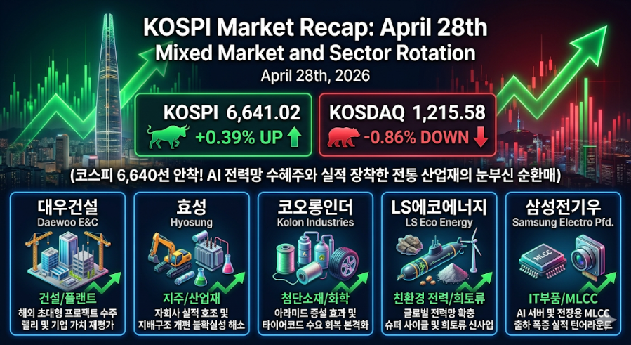 KOSPI는 0.39% 상승하며 상승 흐름을 이어갔고, 거래대금도 증가했습니다. 반면 KOSDAQ은 소폭 하락하며 단기 차익 실현 움직임이 나타났습니다.