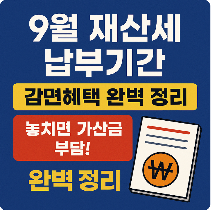 안녕하세요 😊 이번 글에서는 많은 분들이 궁금해하는 9월 재산세 납부에 대해 정리해보려고 해요. 매년 7월과 9월은 재산세 납부의 중요한 시기인데, 특히 9월은 주택분 재산세 2기분과 토지분 재산세가 함께 부과되기 때문에 준비가 꼭 필요합니다. 혹시 기한을 놓치면 **가산금 3%**가 즉시 붙는다는 사실, 알고 계셨나요? 오늘은 재산세 납부기간, 대상, 감면혜택, 납부방법까지 한눈에 볼 수 있도록 풀어서 알려드릴게요!